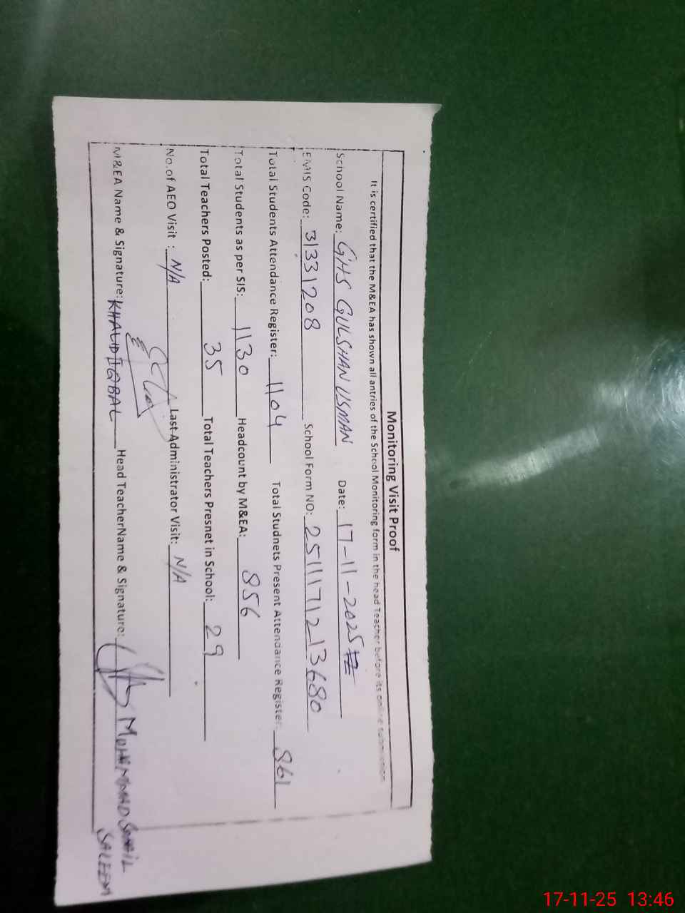 | Attendance Register | Head Teacher | MEA with School | Visit Proof |