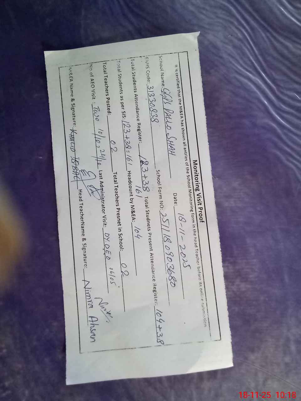 | Attendance Register | Head Teacher | MEA with School | Visit Proof |
