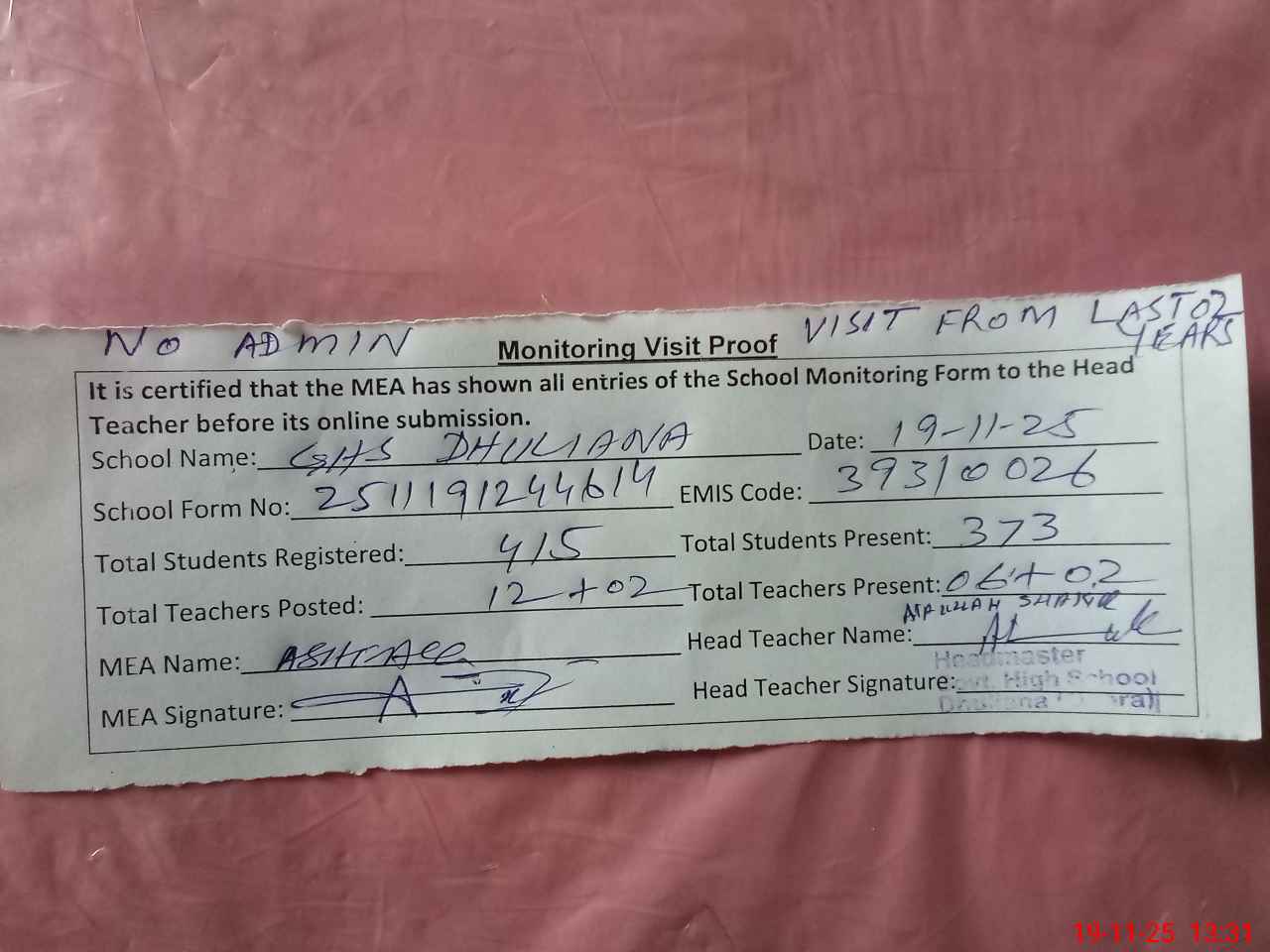 | Attendance Register | Head Teacher | MEA with School | Visit Proof |