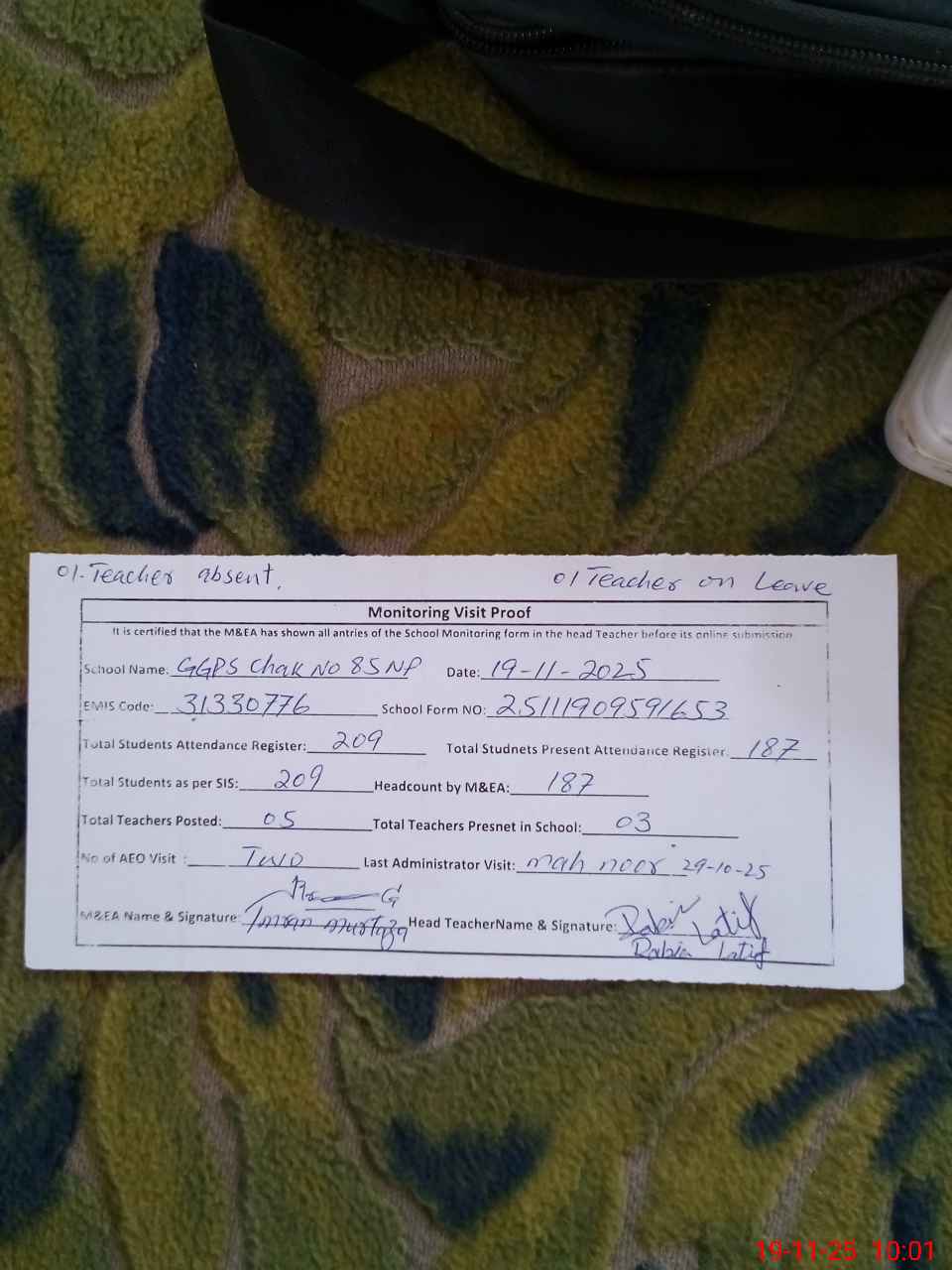 | Attendance Register | Head Teacher | MEA with School | Visit Proof |