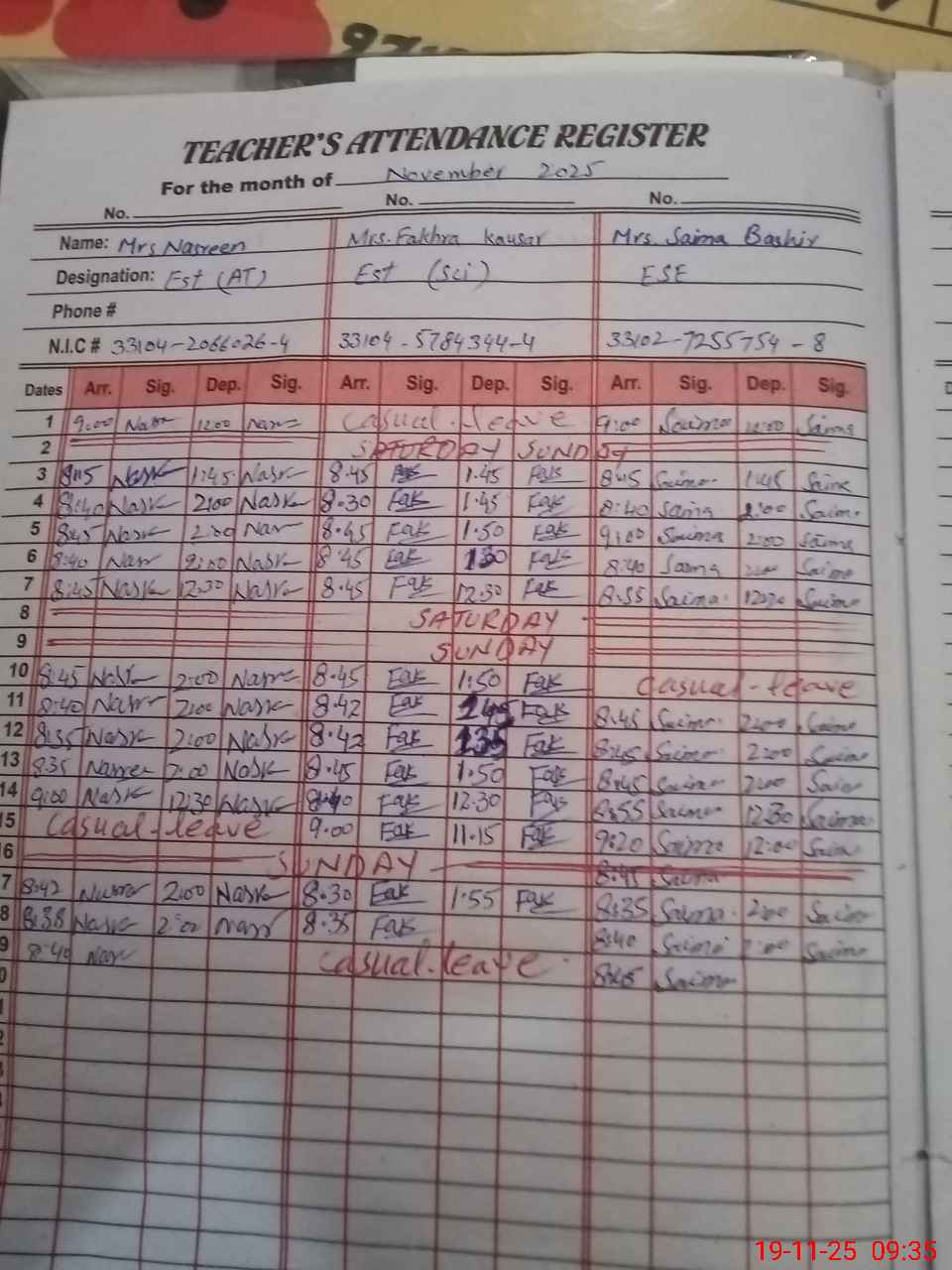 | CNIC | Full Name | Designation | R/C | Absence during last cal. month |