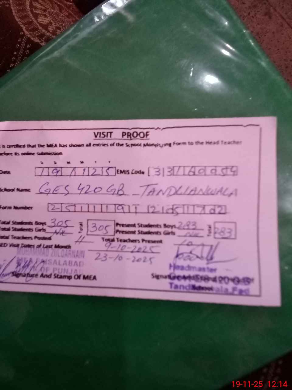| Attendance Register | Head Teacher | MEA with School | Visit Proof |