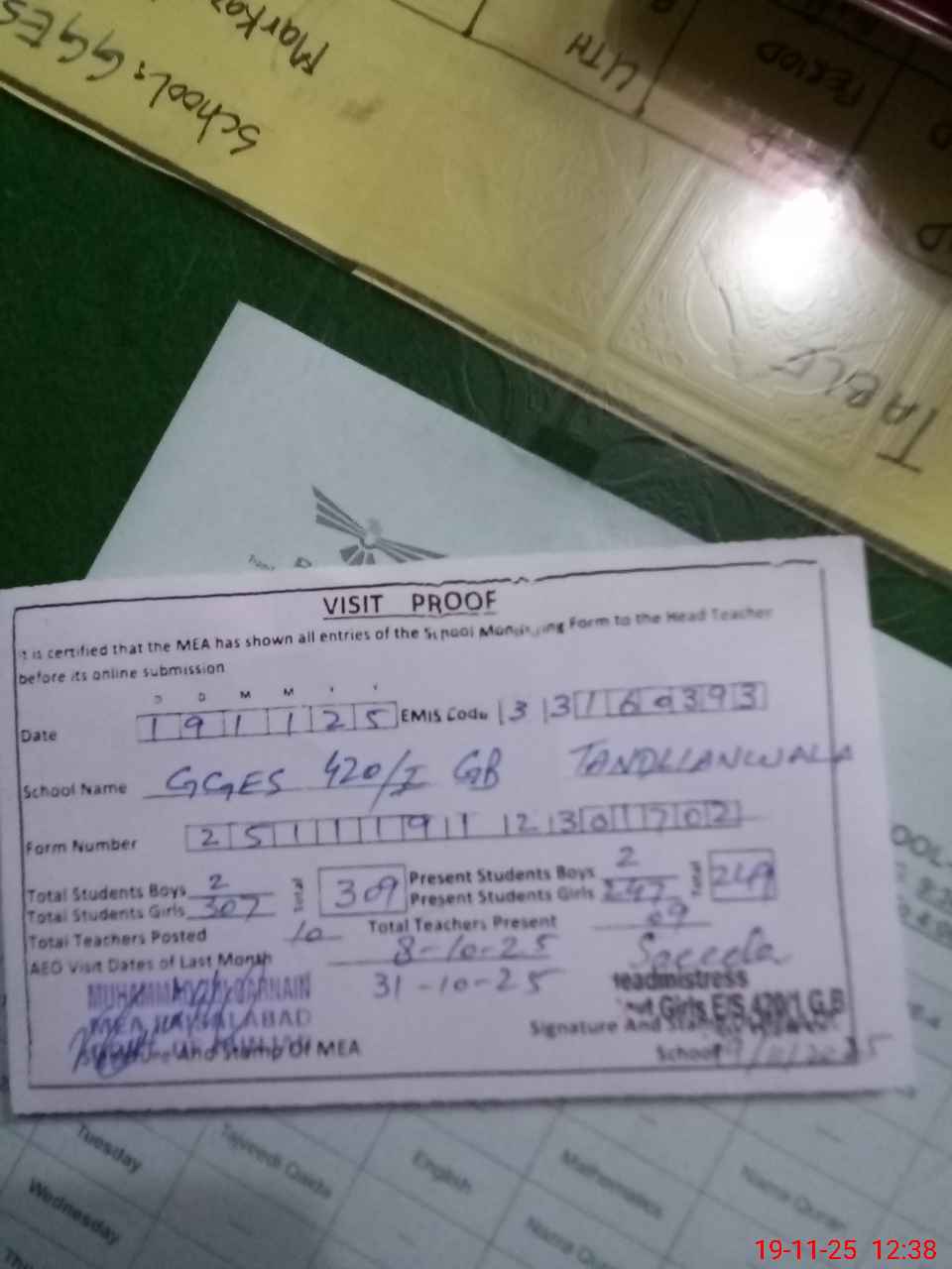 | Attendance Register | Head Teacher | MEA with School | Visit Proof |