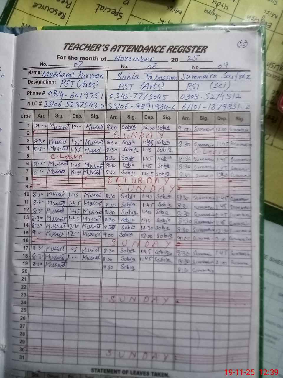 | CNIC | Full Name | Designation | R/C | Absence During Last Calender Month |