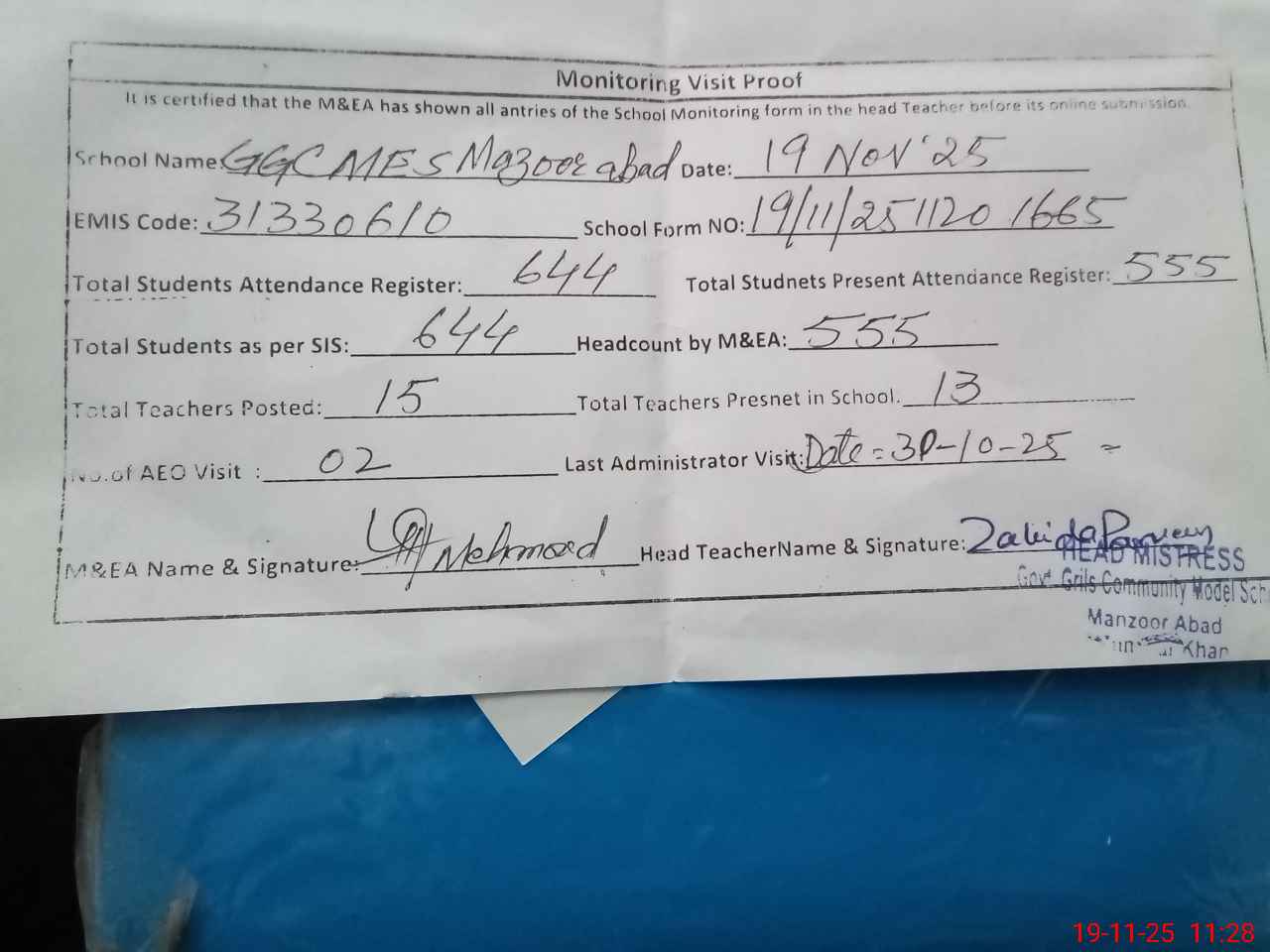 | Monitoring Date: 19-11-2025 | Start Time: 19-11-2025 10:40 AM | End Time: 19-11-2025 11:28 AM | Name of MEA: Ma**** UlHa**** | |