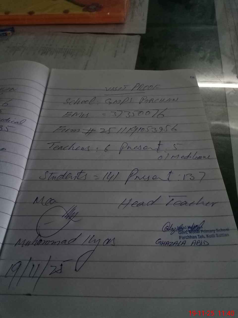 | Attendance Register | Head Teacher | MEA with School | Visit Proof |