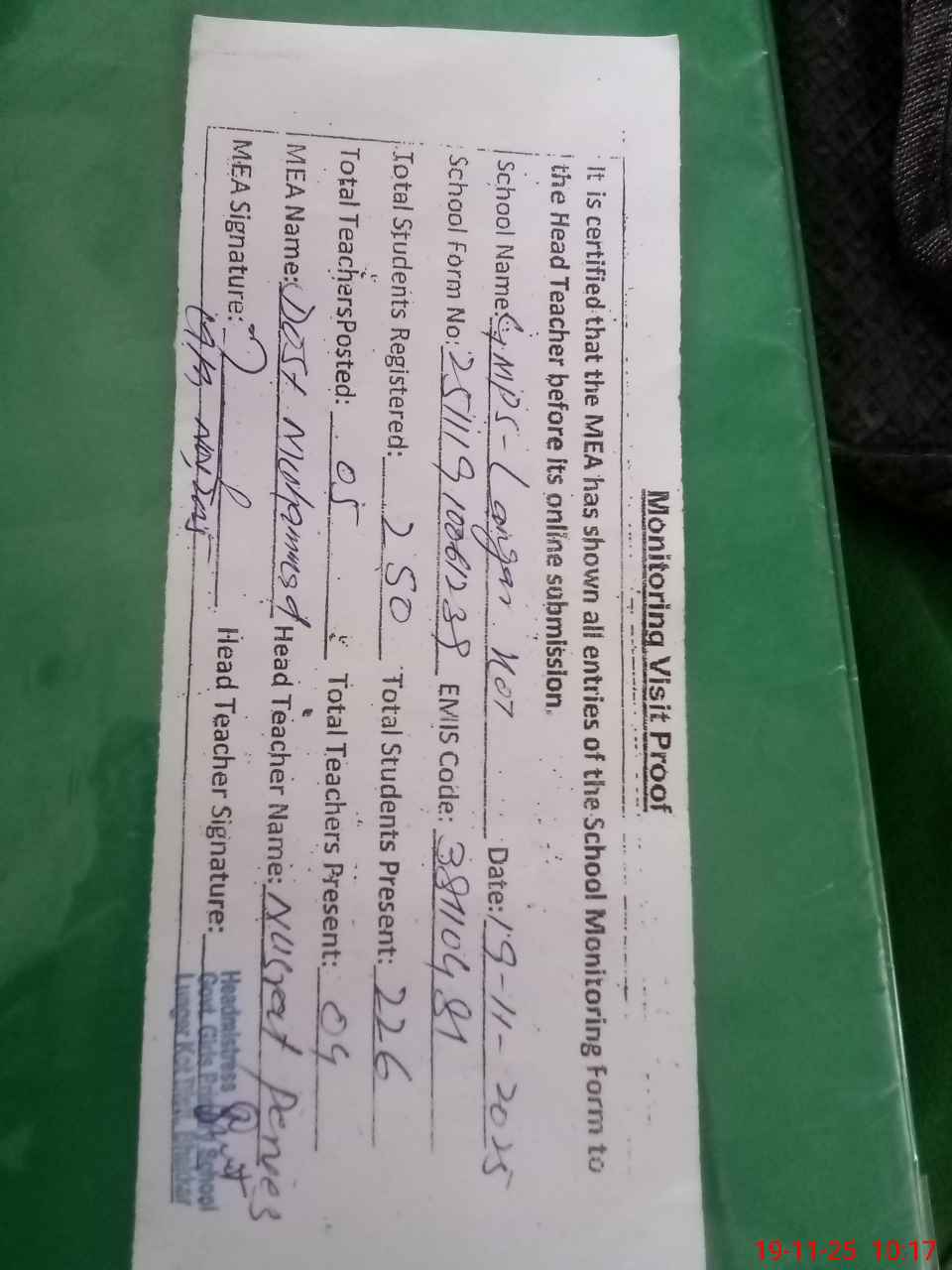 | Remarks (Use Separate Page if Required): All the entered data loudly share with the head teacher before submitting Last visited the subject school by Educational Authority Tayyabah Siddique AEO 29th October 2025 | |||||