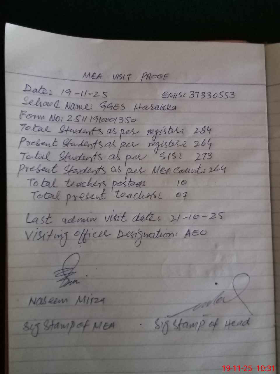 | Attendance Register | Head Teacher | MEA with School | Visit Proof |