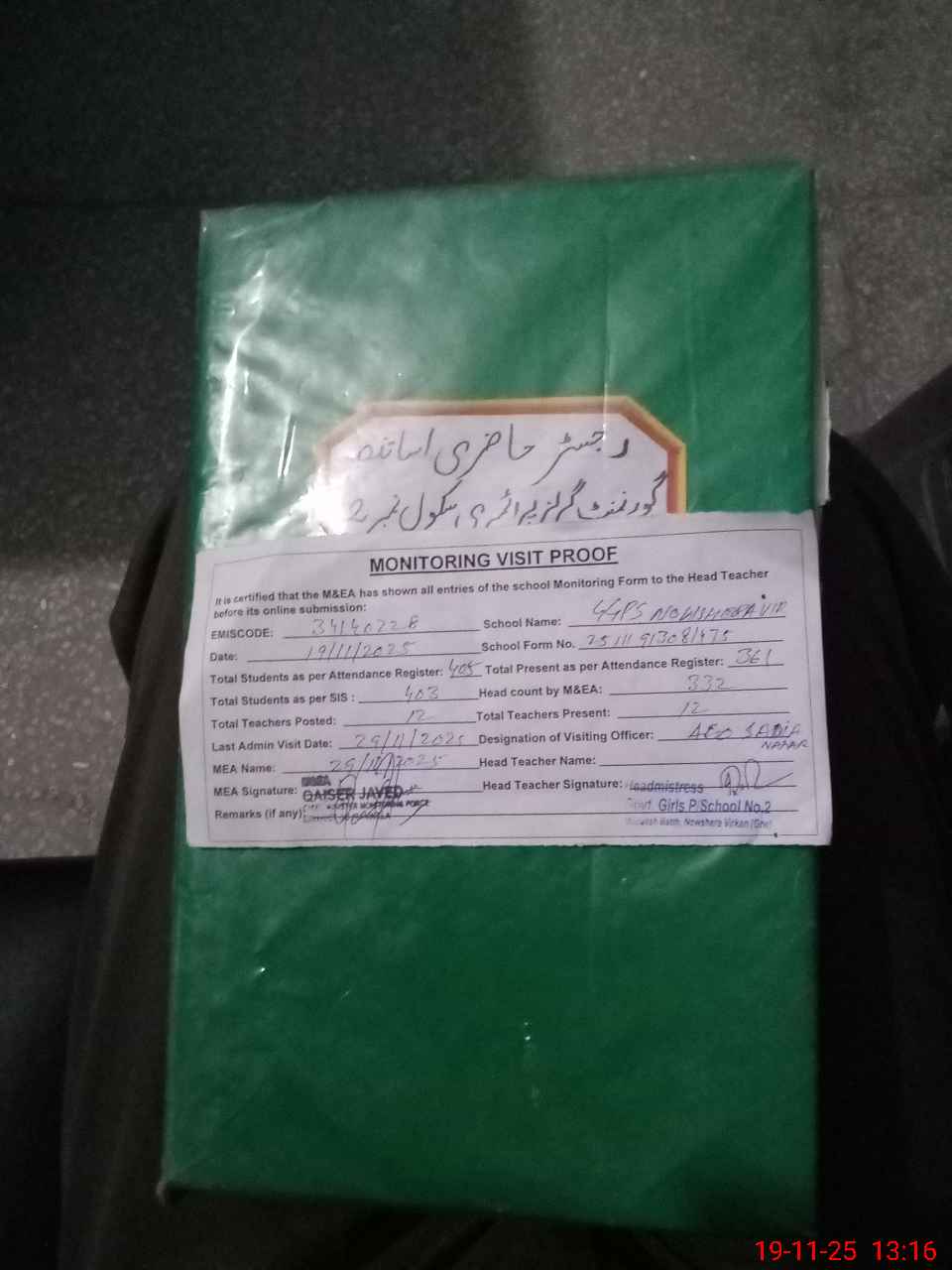 | Attendance Register | Head Teacher | MEA with School | Visit Proof |