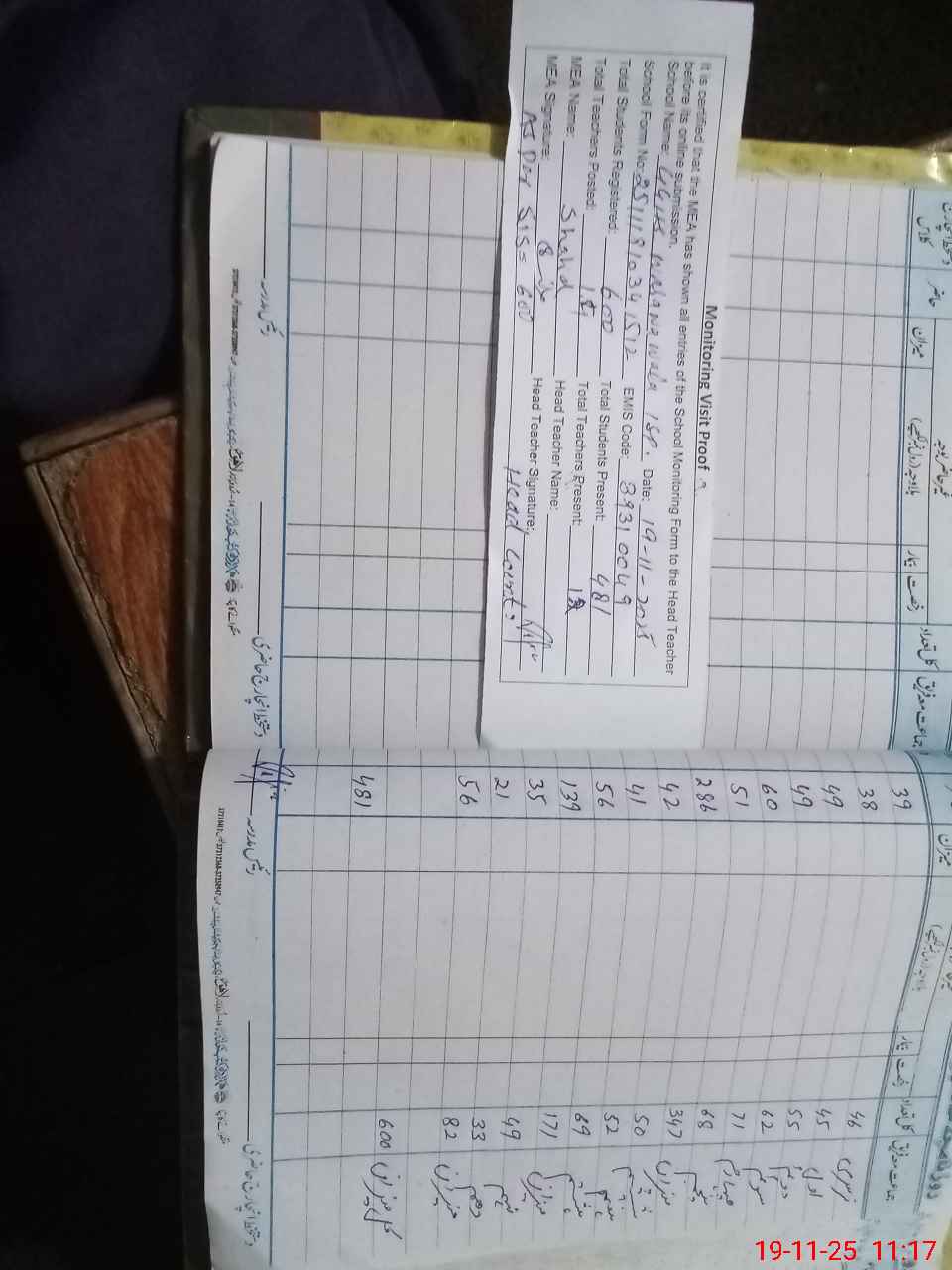 | Attendance Register | Head Teacher | MEA with School | Visit Proof |