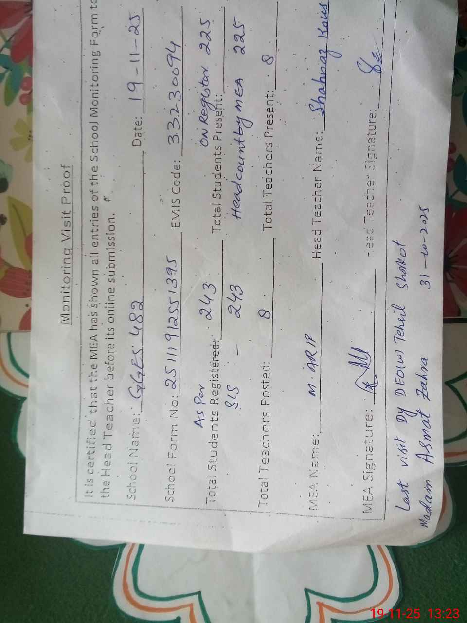 | EMIS Code: 33230094 | Name of School: GGES CHAK NO 482 JB | |||