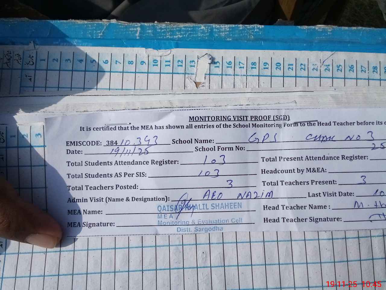 | Attendance Register | Head Teacher | MEA with School | Visit Proof |