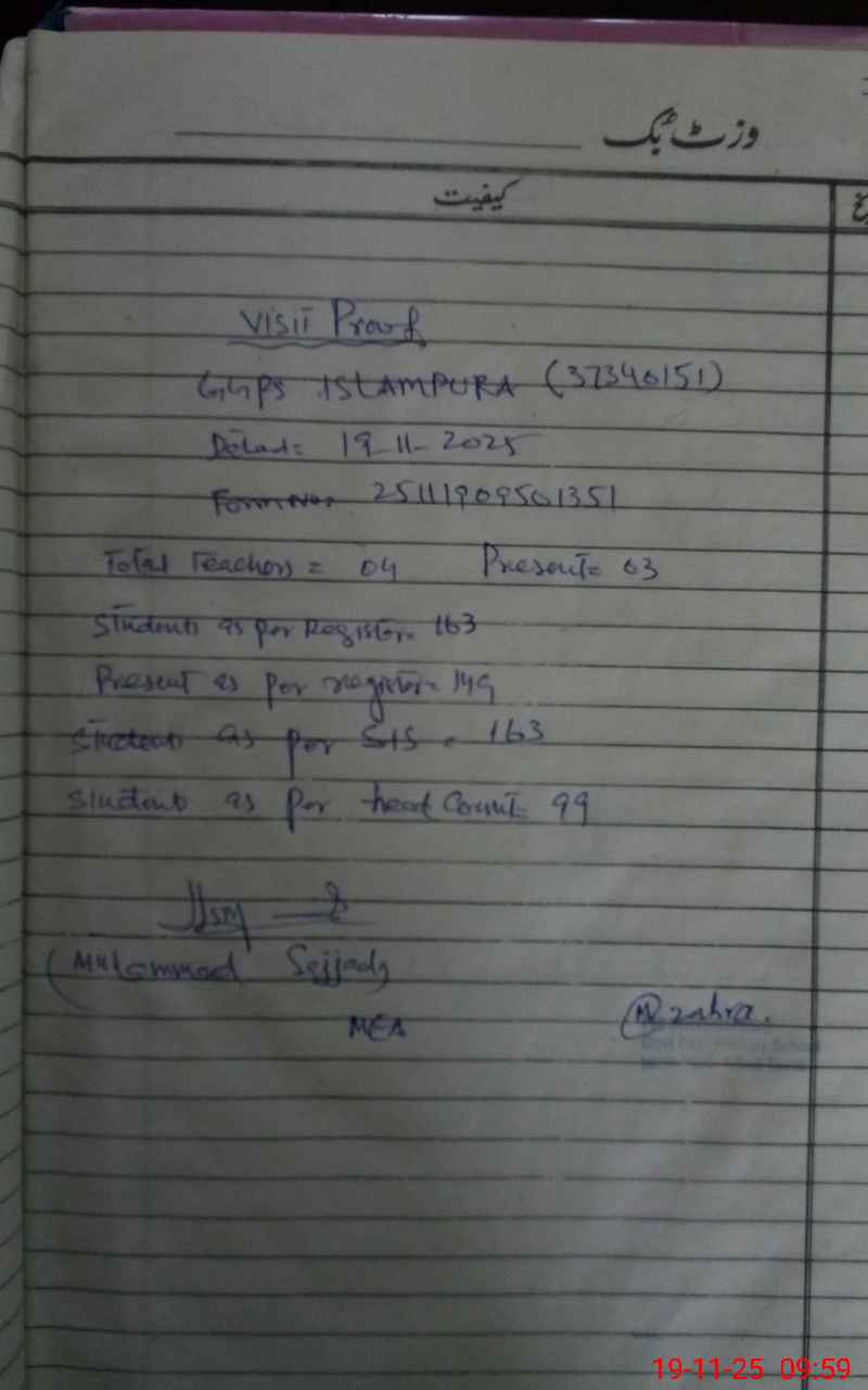 | Remarks (Use Separate Page if Required): There are 03 washrooms in school one was locked and other 02 were blocked Present students as per register were 149 while only 99 were present when head count Unregistered students are also available in kg class exact figgers cannot mentioned because attendance register not available at school | |||||