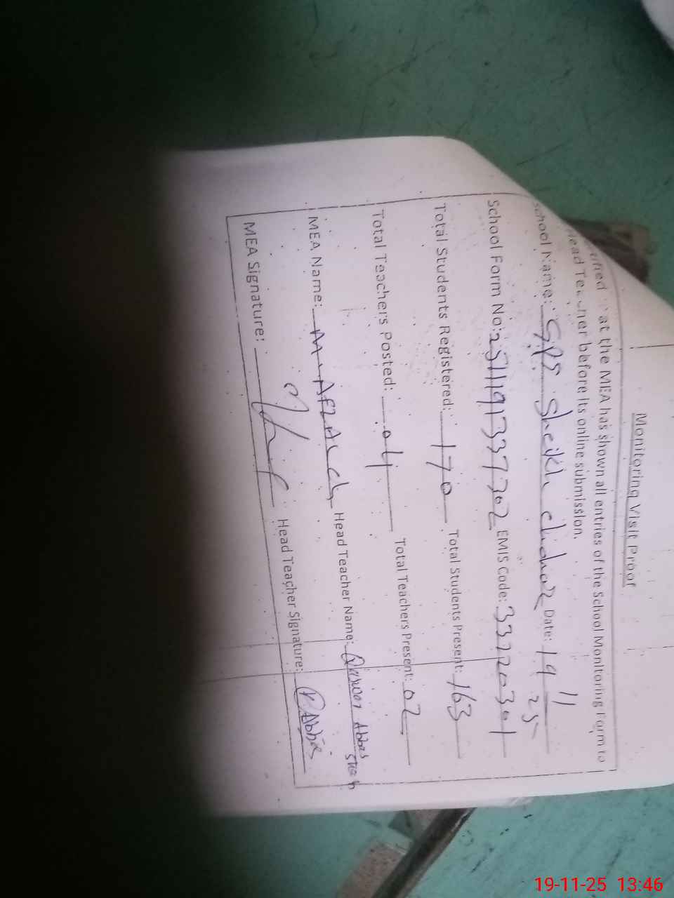 | Attendance Register | Head Teacher | MEA with School | Visit Proof |