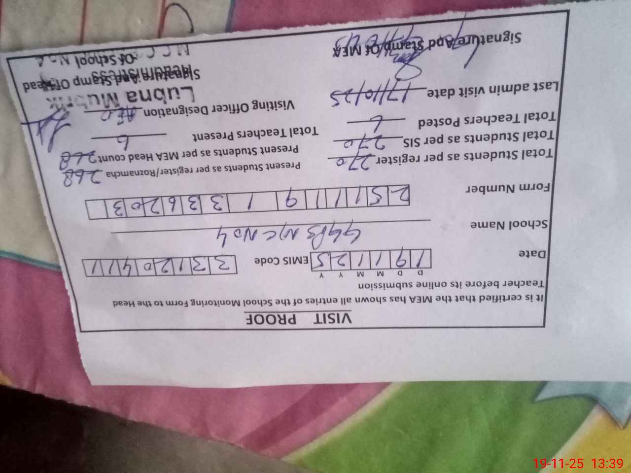 | Certified that this School was Inspected by the Undersigned MEA/DMO Today and the Information Stated Above is as Per Record. | |||||