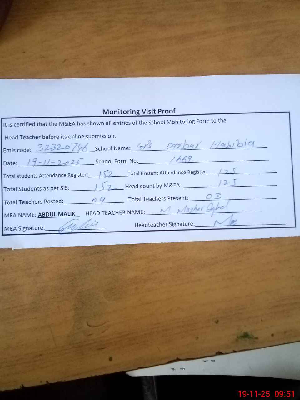 | Attendance Register | Head Teacher | MEA with School | Visit Proof |