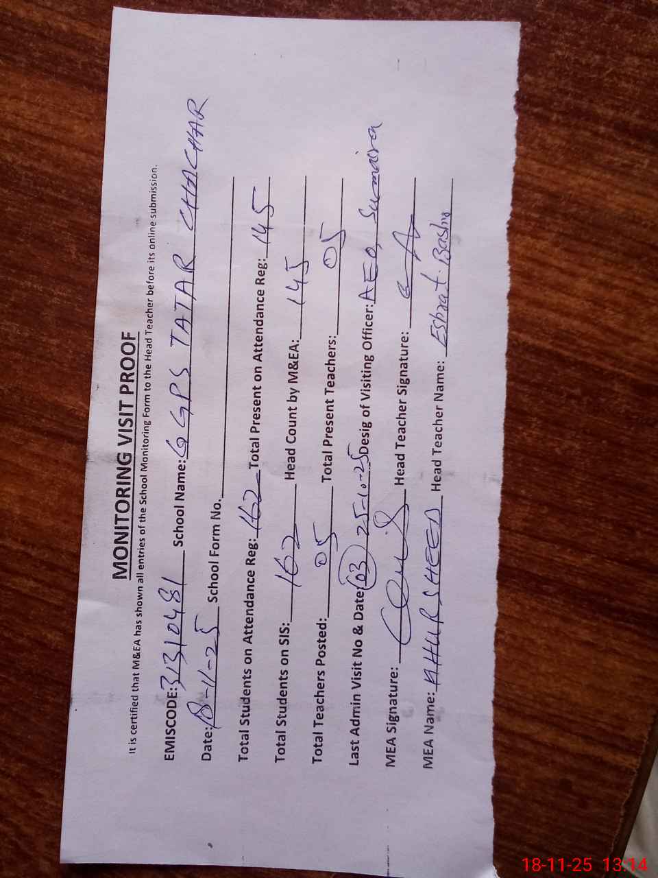 | Attendance Register | Head Teacher | MEA with School | Visit Proof |