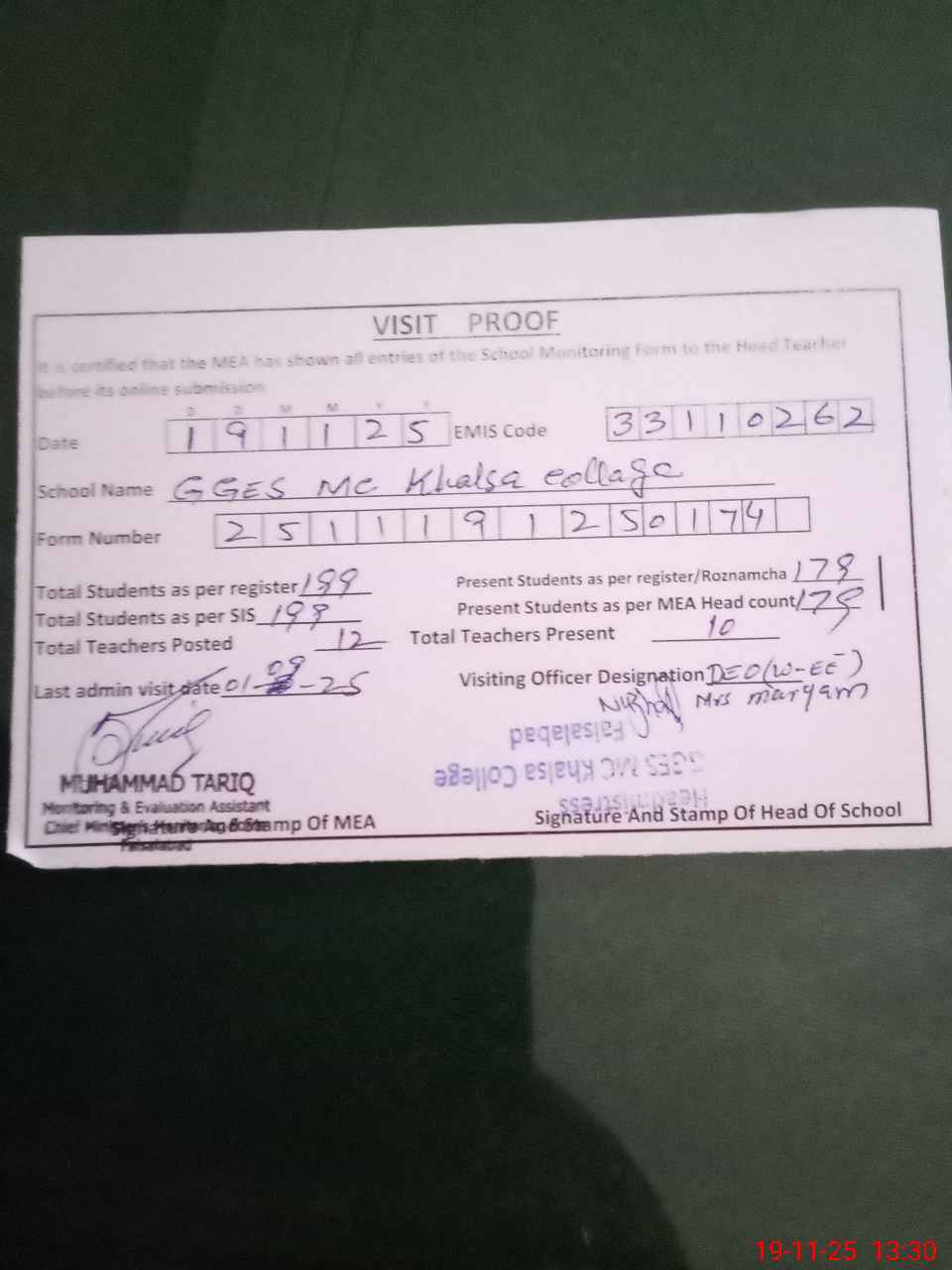 | Attendance Register | Head Teacher | MEA with School | Visit Proof |