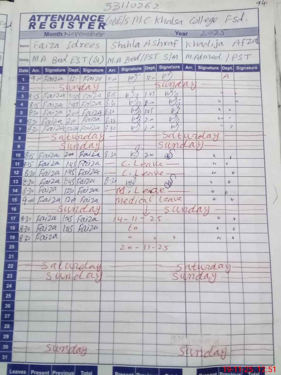 | CNIC | Full Name | Designation | R/C | Absence During Last Calender Month |