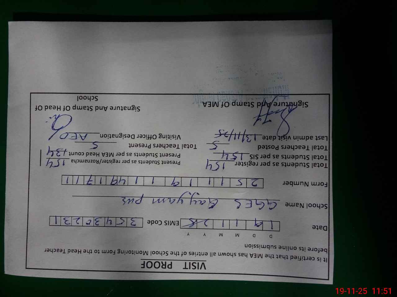 | Attendance Register | Head Teacher | MEA with School | Visit Proof |