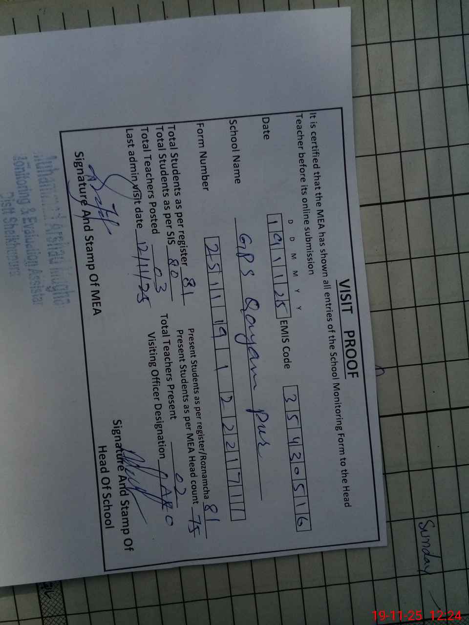 | Attendance Register | Head Teacher | MEA with School | Visit Proof |