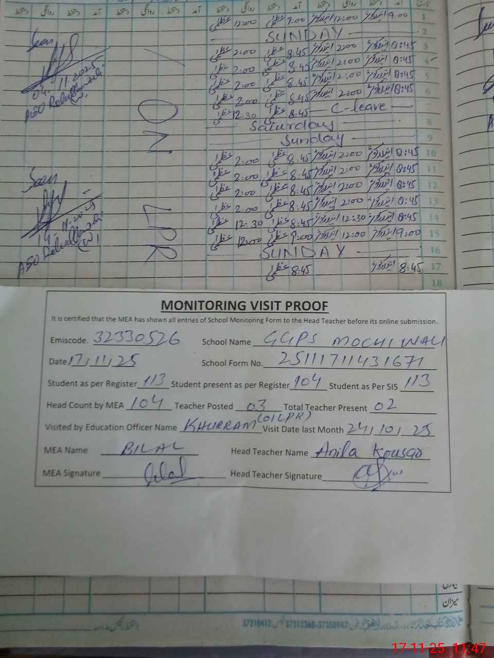| Attendance Register | Head Teacher | MEA with School | Visit Proof |