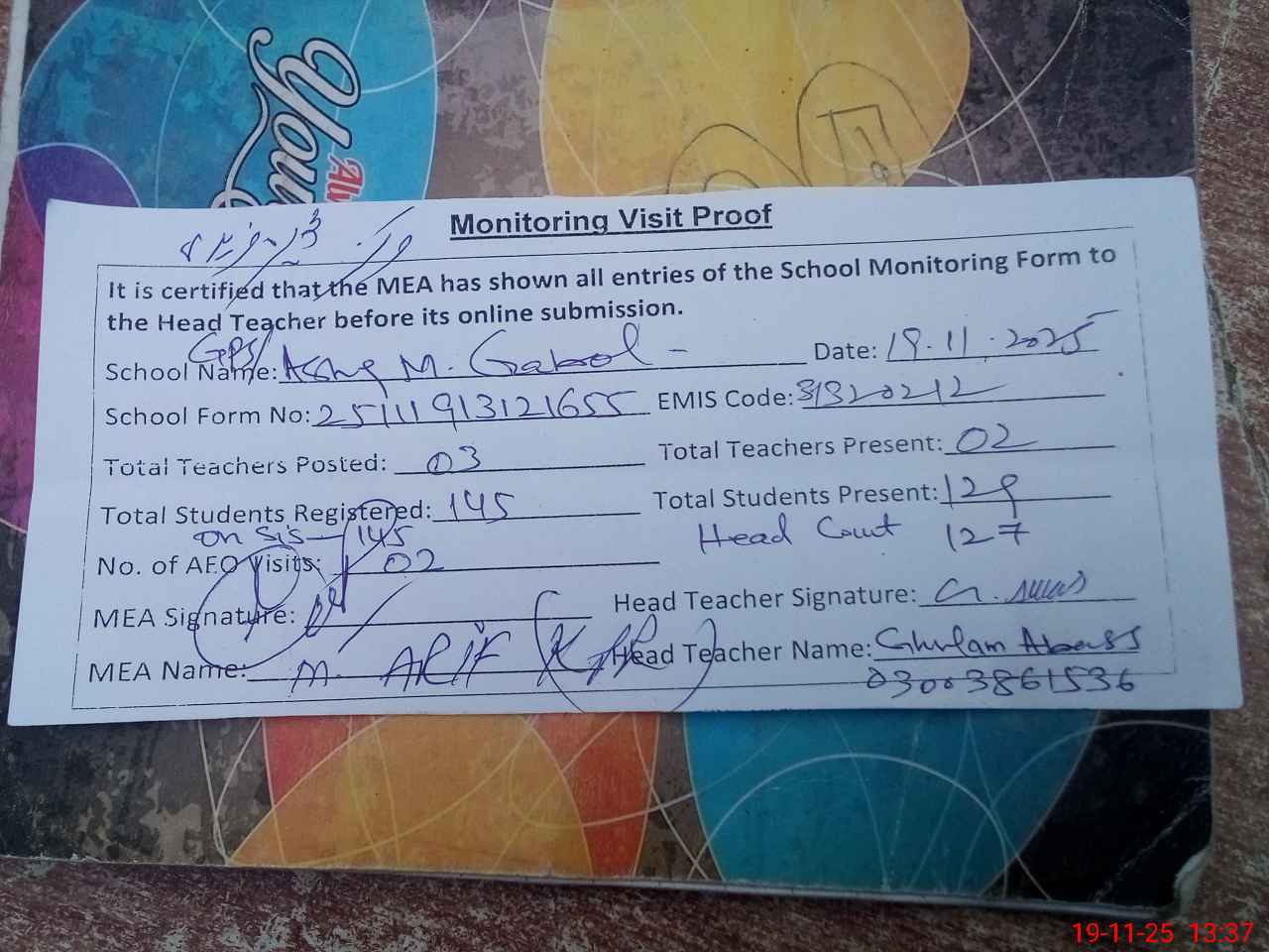 | EMIS Code: 31320212 | Name of School: GPS ASHIQ MUHAMMAD (GABOOL) | |||