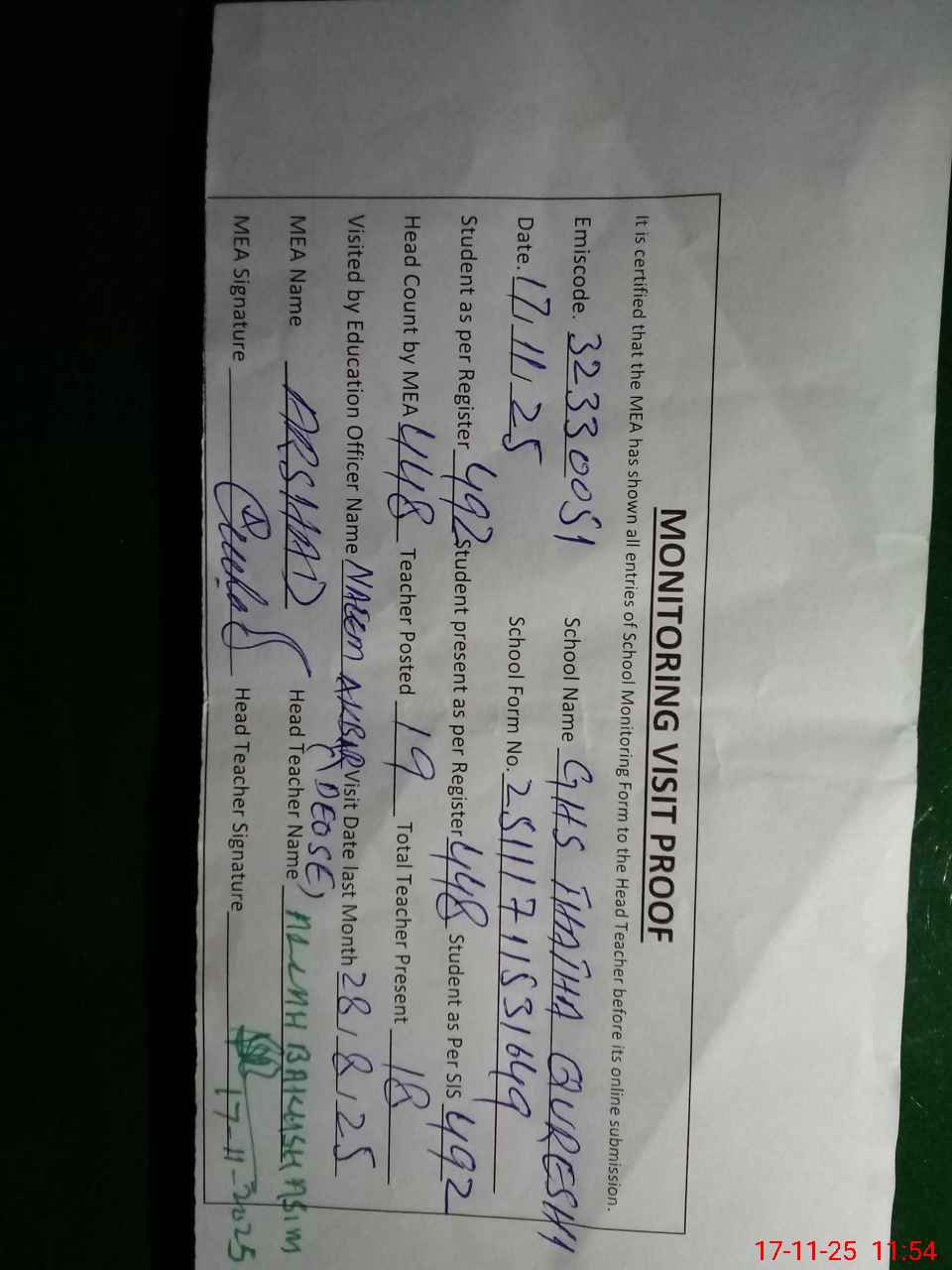 | Attendance Register | Head Teacher | MEA with School | Visit Proof |