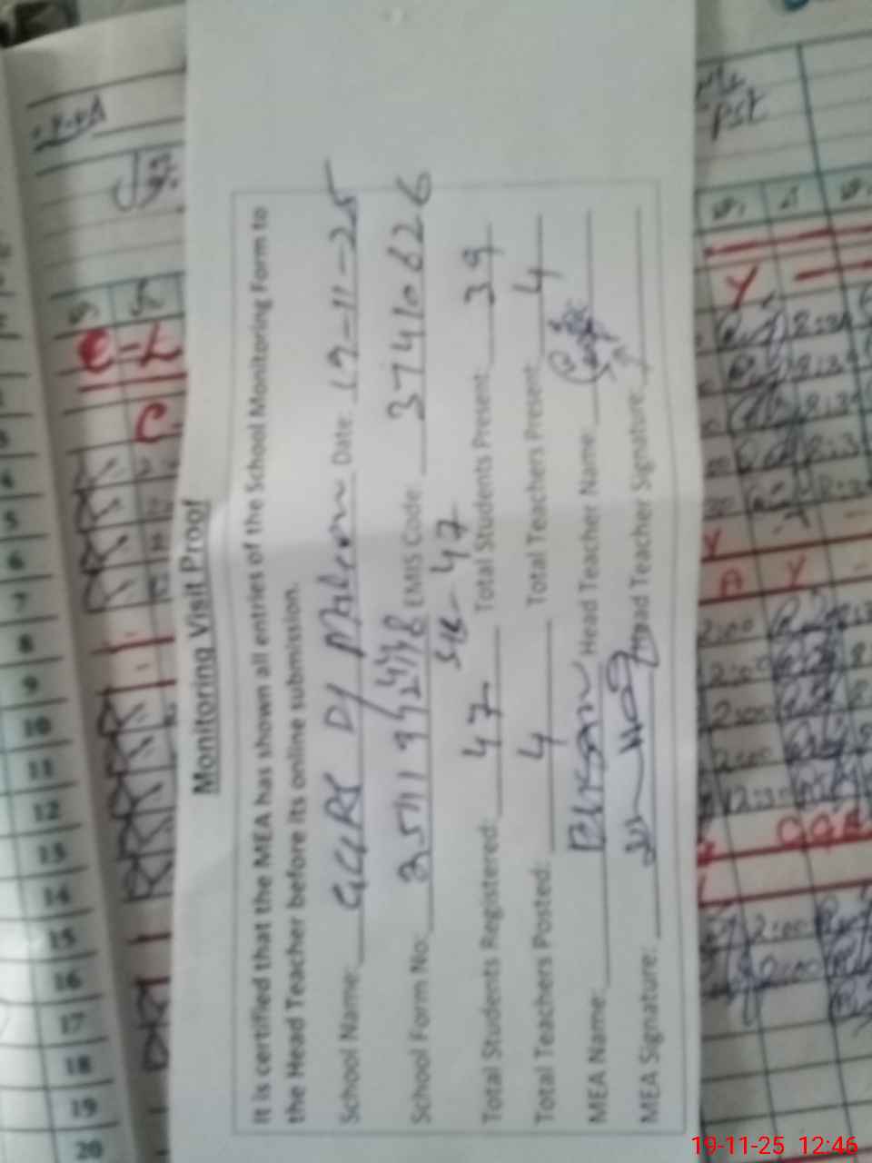 | Attendance Register | Head Teacher | MEA with School | Visit Proof |