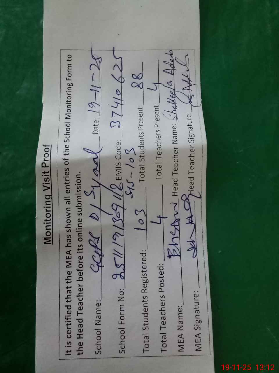 | Attendance Register | Head Teacher | MEA with School | Visit Proof |