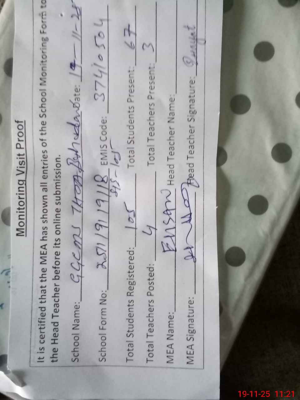 | Attendance Register | Head Teacher | MEA with School | Visit Proof |