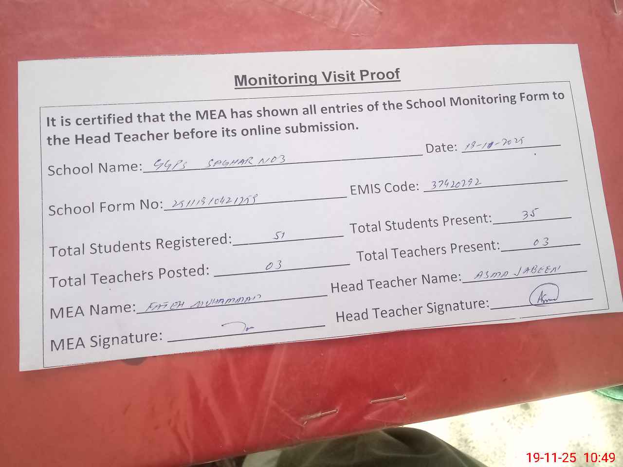 | Attendance Register | Head Teacher | MEA with School | Visit Proof |