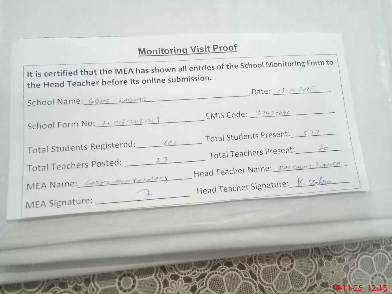 | Attendance Register | Head Teacher | MEA with School | Visit Proof |