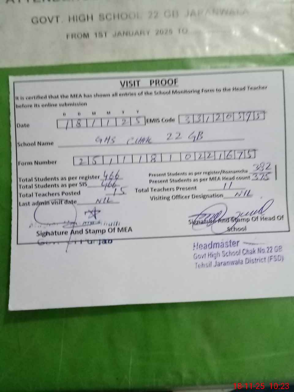 | EMIS Code: 33120595 | Name of School: GHS CHAK 22 GB PO 22 GB JARANWALA | |||