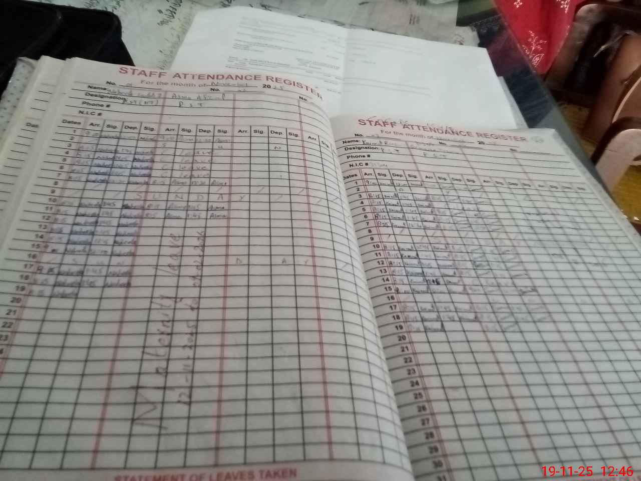 | CNIC | Full Name | Designation | R/C | Absence During Last Calender Month |
