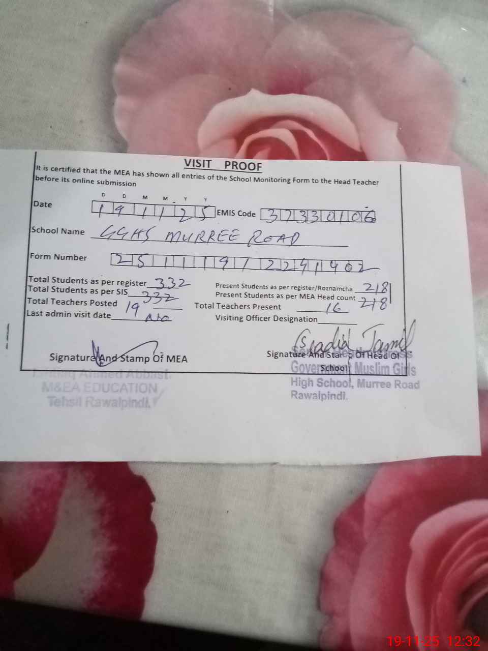 | Certified that this School was Inspected by the Undersigned MEA/DMO Today and the Information Stated Above is as Per Record. | |||||