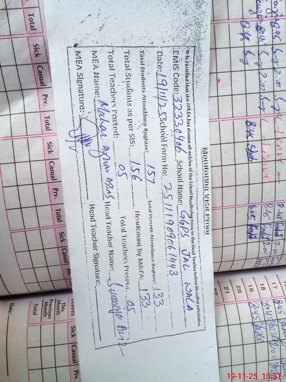 | Attendance Register | Head Teacher | MEA with School | Visit Proof |