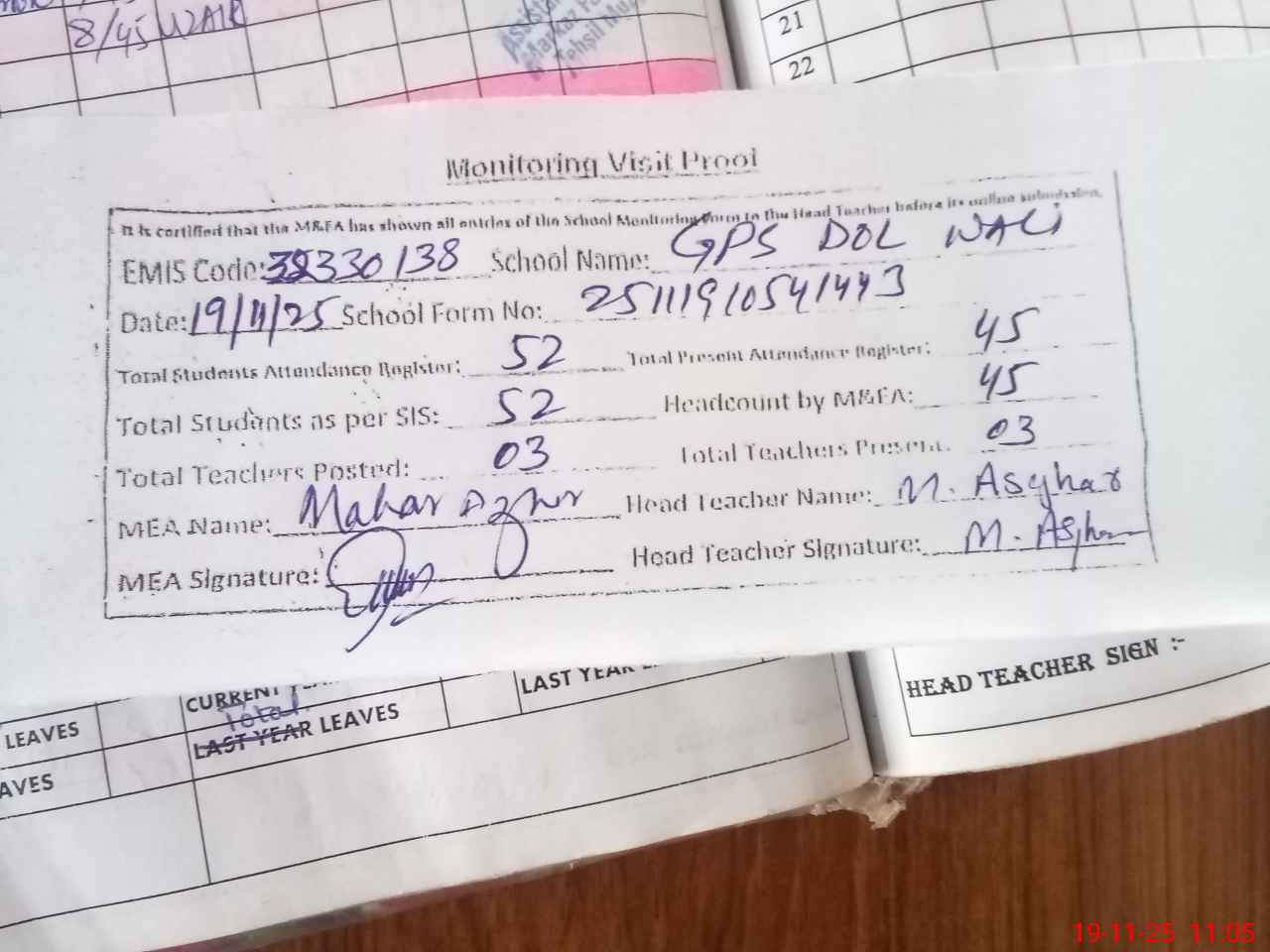 | EMIS Code: 32330138 | Name of School: GPS DOL WALI | |||