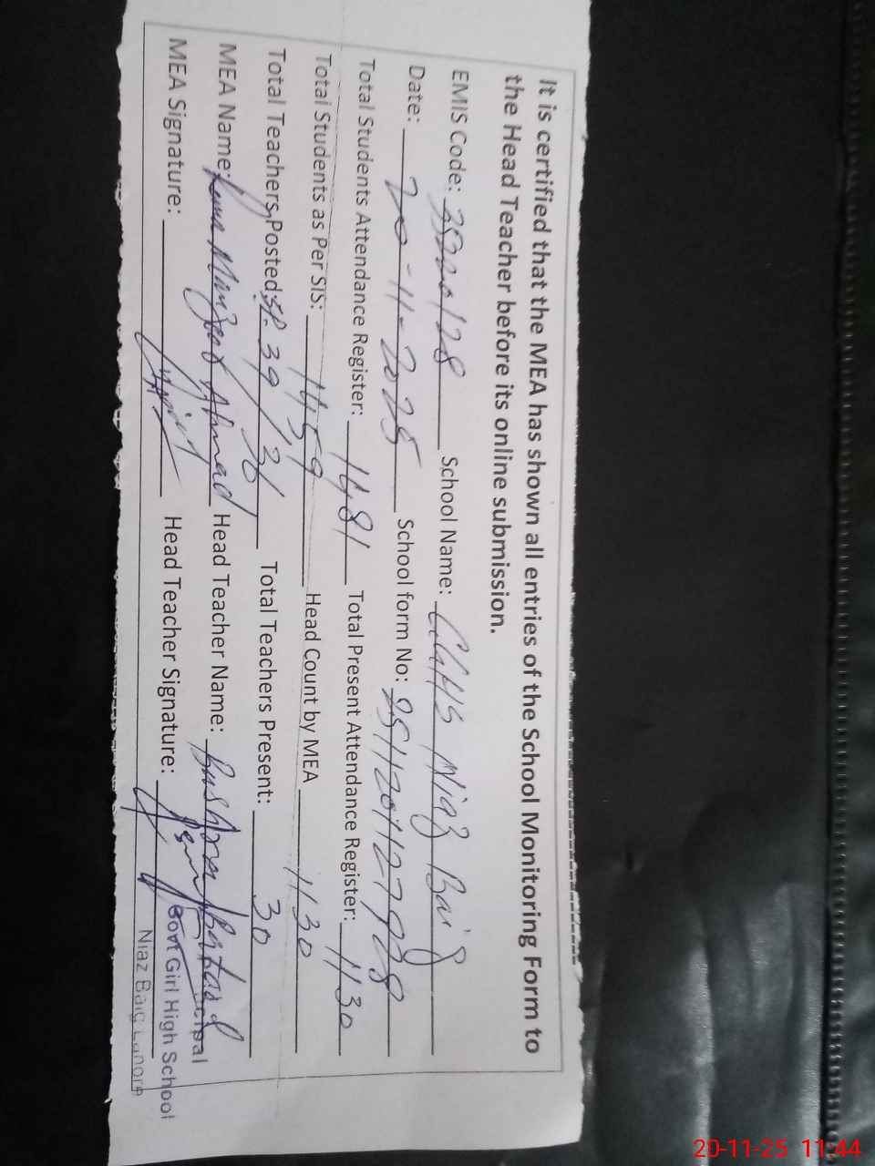 | EMIS Code: 35220128 | Name of School: GGHS NIAZ BAIG | |||