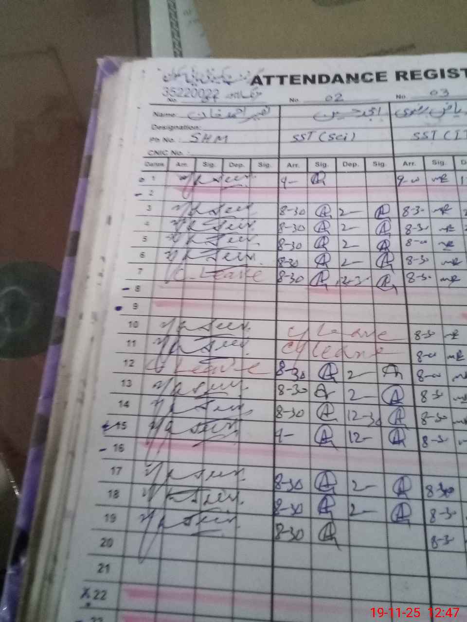 | CNIC | Full Name | Designation | R/C | Absence during last cal. month |
