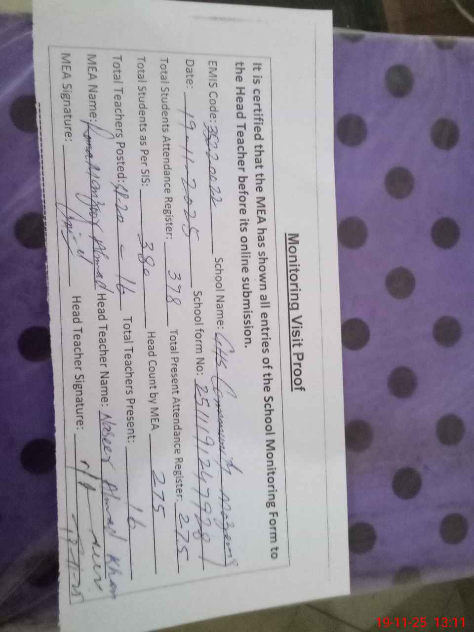 | Attendance Register | Head Teacher | MEA with School | Visit Proof |
