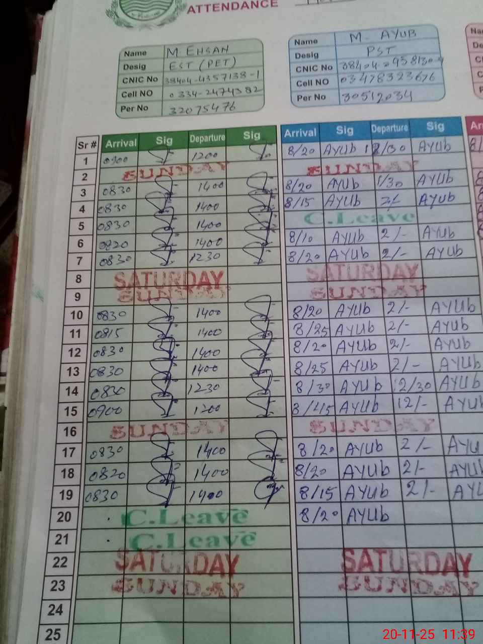 | CNIC | Full Name | Designation | R/C | Absence During Last Calender Month |