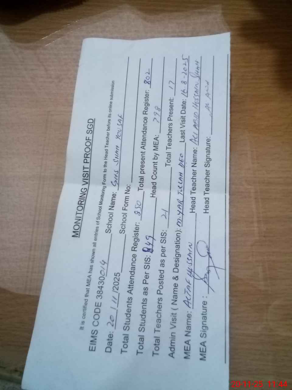 | Attendance Register | Head Teacher | MEA with School | Visit Proof |