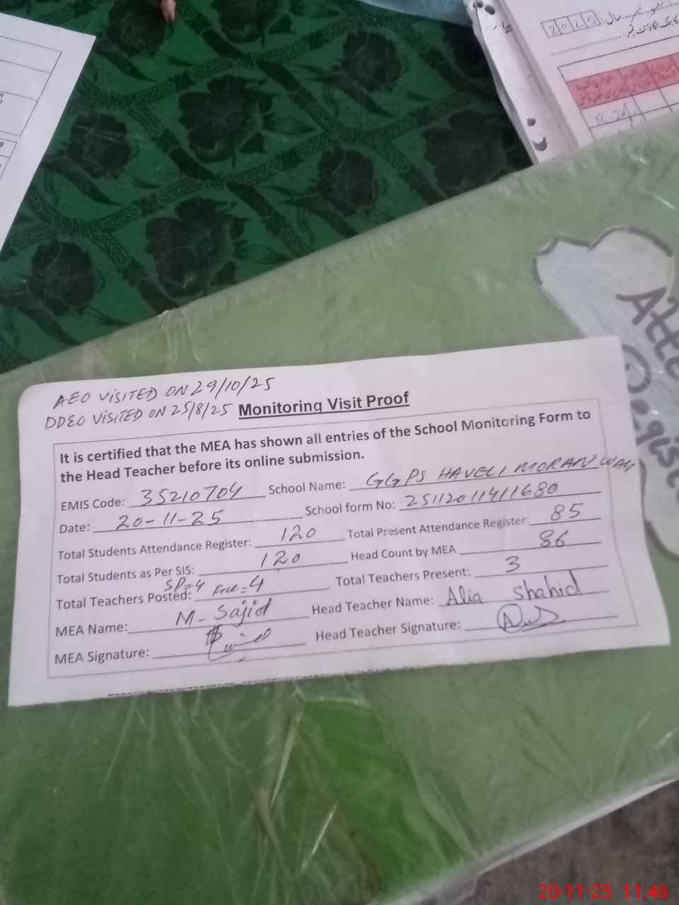 | EMIS Code: 35210704 | Name of School: GGPS HAVELI MORAN WALI | |||