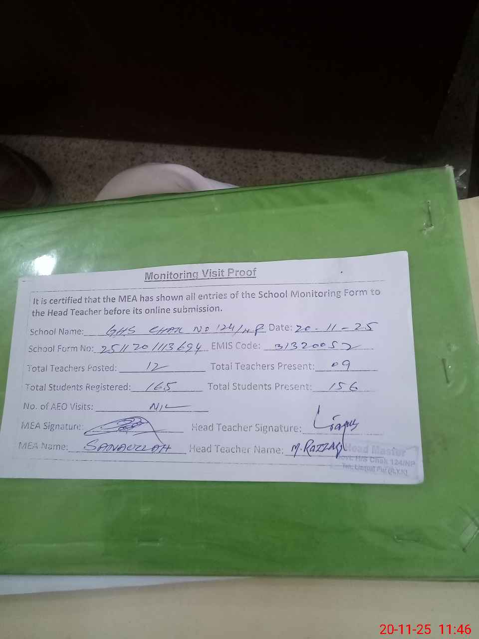 | Attendance Register | Head Teacher | MEA with School | Visit Proof |