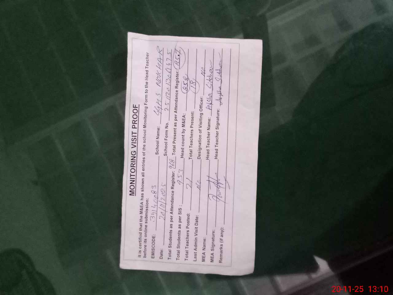 | Attendance Register | Head Teacher | MEA with School | Visit Proof |
