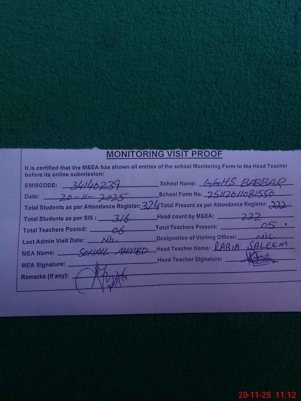 | Attendance Register | Head Teacher | MEA with School | Visit Proof |