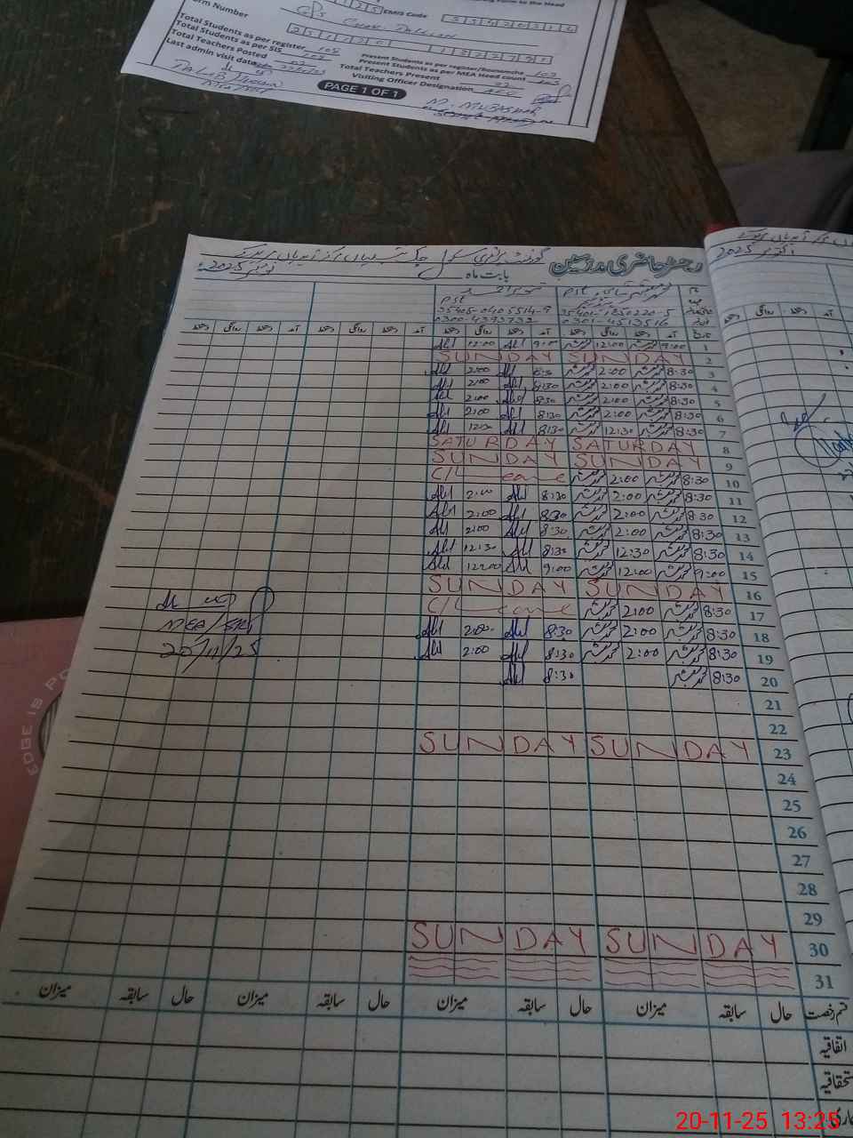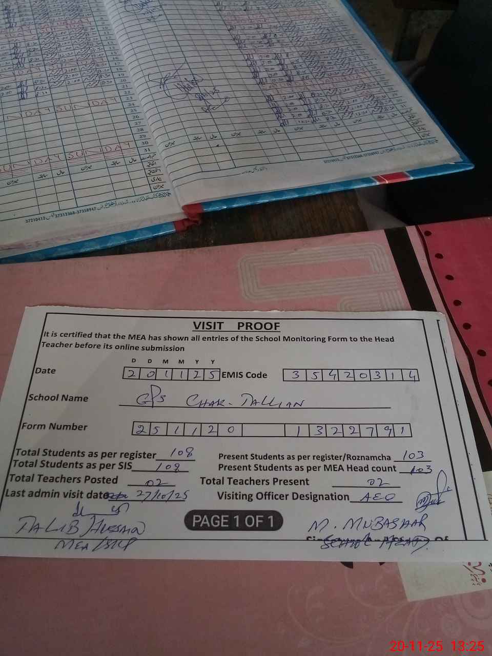 | Attendance Register | Head Teacher | MEA with School | Visit Proof |