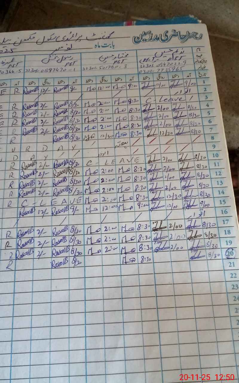 | CNIC | Full Name | Designation | R/C | Absence During Last Calender Month |