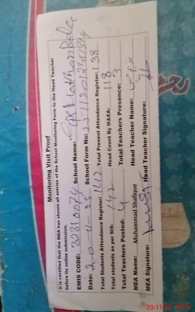 | Attendance Register | Head Teacher | MEA with School | Visit Proof |